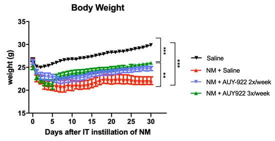 Body weight changes in mice after intratracheal instillation of 0.625 mg/kg nitrogen mustard (NM) or saline and treatment with AUY-922; ***: p < 0.001, **: p < 0.01 with ANOVA and Turkey’s. n = 6 mice per group.