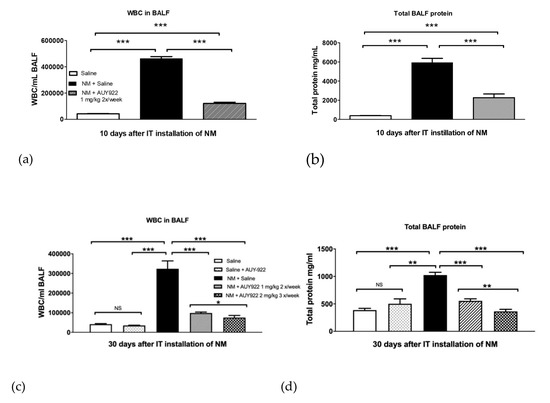 As we previously published [18], NM elicits dramatic alveolar inflammation, which peaks at day 10 post-instillation and persists until day 30. Here, we analyzed white blood cells (WBC) and total protein concentration in bronchoalveolar lavage fluid (BALF) at 10- and 30-days post-exposure, in all groups. Mice instilled with 0.625 mg/kg NM and treated intraperitoneally with AUY-922 1 mg/kg, 2 times per week, showed significantly lower WBC levels already at 10 days when compared to controls (p < 0.001) (Figure 2a). After 30 days, this effect was sustained (p < 0.001). At the higher dose (2 mg/kg 3×/week), AUY-922 drastically diminished WBC concentration in BALF, when compared to the NM-treated mice (p < 0.001), exhibiting an even stronger effect than that observed in mice treated with AUY-922 1mg/kg 2×/week (p < 0.05; Figure 2c).