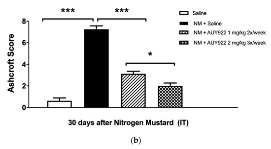 A decrease in body weight was noted the day after instillation of either nitrogen mustard or saline. Mice treated with saline, recovered quickly, and resumed normal weight gain (Figure 1). The decrease in body weight in mice instilled with NM was more severe than in the saline group (p < 0.001) and continued for 8–10 days. The weight curve of the NM group reached a plateau at day 17 while control mice continued to actively gain weight. Mice, treated with different doses of AUY-922, showed visible improvements already during the first days of observation, and at day 23, the higher dose group (2 mg/kg 3×/week) demonstrated significant mass gain compared to mice instilled with NM and treated with saline (p < 0.01).