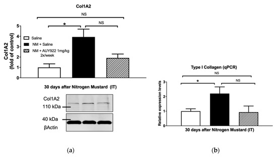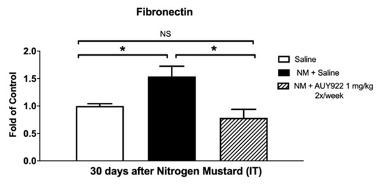 Thus, we confirmed that AUY-922 prevents the development of NM-induced pulmonary fibrosis by modulating the levels of pro-fibrotic markers, reducing collagen expression and deposition and maintaining normal lung dynamics. The suppression of p-HSP90 by low doses of AUY-922 interferes critically within the development of pulmonary fibrosis and may represent a new approach for victims exposed to nitrogen mustard gases.