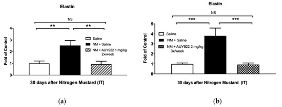The HSP90 inhibitor, AUY-922, blocks the NM-induced elastin production. Total elastin mRNA levels in lung tissue homogenates was determined by real time qPCR, as described in Methods. Mice received 0.625 mg/kg of NM or saline (2 µL/g body weight, intratracheally) on day 0. They then received AUY-922 (1 mg/kg, 2×/week (a) or 2 mg/kg, 3×/week (b) intraperitoneally) for 30 days, starting 24 h after NM. Means ± SEM; n = 4 mice per group; **: p < 0.01, ***: p < 0.001, NS: not significant, with ANOVA and Tukey’s.