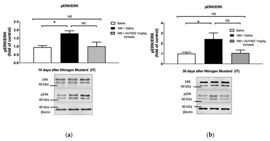 Mechlorethamine hydrochloride 98%, red protein G affinity gel beads, RIPA buffer and protease inhibitor cocktail were obtained from Sigma-Aldrich Corporation (St. Louis, MO, USA). The HSP90 Inhibitor AUY-922 (NVP-AUY922, 99.1% purity) was purchased from Selleck Chemicals (Houston, TX, USA). Socumb (pentobarbital) United States Pharmacopeia (USP) grade, Anased (xylazine) USP grade and Ketaset (ketamine) USP grade were supplied by Henry Schein Animal Health (Pittsburg, PA, USA). 10% formaldehyde was purchased from Thermo Fisher Scientific (Waltham, MA, USA), EDTA and Western blot membranes from GE Healthcare (Chicago, IL, USA), TRIzol® and SuperScript™ IV VILO Reverse transcription Kit from Invitrogen (Carlsbad, CA, USA), RNeasy Mini Kit from QIAGEN (Germantown, MD, USA) and SYBR Green Master Mix from Applied Biosystems (Carlsbad, CA, USA). All primers used for real time quantitative PCR were purchased from Integrated DNA Technologies, Inc. (Coralville, IA, USA). All antibodies used in Western blots and immunoprecipitation have published immunospecificity data available online. For antibodies used in Western blots, rabbit total and phosphorylated Erk1/2 were obtained from Cell Signaling Technology, Inc. (Danvers, MA, USA), mouse monoclonal anti-β-actin from Sigma-Aldrich Corporation, and IRDye 800CW Goat anti-rabbit and IRDye 680RD Goat anti-mouse from LI-COR Biosciences (Lincoln, NE, USA). For antibodies used in immunoprecipitation, mouse anti-phosphotyrosine was from Invitrogen, and mouse anti-Hsp90 from BD Transduction Laboratories (Franklin Lakes, NJ, USA).