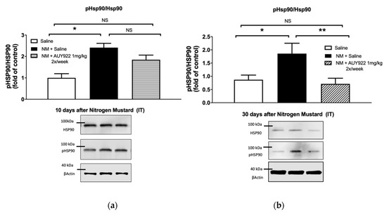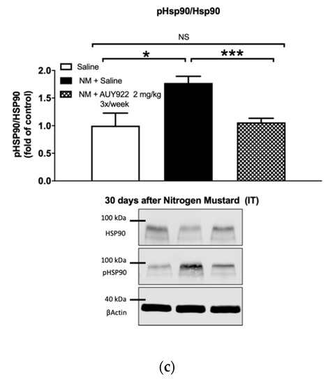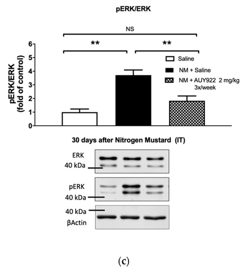 We analyzed the ability of the HSP90 inhibitor AUY-922, to inhibit the expression of two pro-fibrotic signaling biomarkers: the activated (phosphorylated) form of extracellular signal-regulated kinase (MAPK/ERK) and of HSP90 (Figure 7 and Figure 8). As we previously reported, instillation of mechlorethamine hydrochloride increases the expression of p-ERK at 4, 10 and 30 days post-exposure [18]. NM also activates HSP90 (P-HSP90) by phosphorylating a tyrosine in position 300, at 30 days post-exposure. Administration of 1 mg/kg AUY-922 2 times per week did not significantly reduce p-ERK expression compared to the NM+saline group, at 10- and 30-days post-exposure (p > 0.05; p > 0.05; Figure 7a,b), even though the NM+AUY-922 group was statistically identical to the saline group. However, 2 mg/kg of AUY-922 injected 3 times per week significantly reduced p-ERK expression when compared to NM-instilled mice treated with saline (p < 0.01; Figure 7c). HP90 activation by NM was not affected by AUY-922 at day 10 post instillation, even though the NM+AUY-922 and saline groups were statistically similar. However, at 30 days post-exposure, both AUY-922 dosages successfully blocked HSP90 activation, when compared to NM-instilled mice treated with saline (lower dose: p < 0.01; higher dose: p < 0.001; Figure 8b,c). These data suggest that the phosphorylation of HSP90 is a continuous escalating process, which follows the progressive fibrotic process in the lungs.