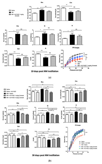 Changes in lung mechanics were evident as early as 10 days after mechlorethamine hydrochloride instillation. Total respiratory system resistance (Rrs), elastance (Ers), tissue damping (G) and tissue elastance (H) increased significantly in NM-instilled mice at day 10 when compared to saline controls (p < 0.001; p < 0.05; p < 0.05 and p < 0.05, respectively). Similarly, 10 days after NM-instillation reduced values of respiratory system compliance (Crs), static compliance (Cst) and total lung capacity (A) were observed (p < 0.01; p < 0.001; p < 0.001, respectively). Treatment with AUY-922 1 mg/kg twice a week for 10 days did not result in significant improvements (Figure 9a). However, when the AUY-922 was administered for 30 days, it completely prevented the loss of compliance and lung stiffness at both dosages (Figure 9b). The study of lung function by FlexiVent also revealed that pressure–volume (PV) loops of NM-instilled mice treated with saline exhibited a characteristic downward shift reflecting stiffer lungs, while PV loops of mice treated with AUY-922 displayed a significantly lesser shift at 10 days (p < 0.05) and at 30 days reached physiological values compatible with controls (p < 0.001). AUY-922 at both dosages improved lung function after NM-exposure, however when employed at 2 mg/Kg 3×/week, it showed a stronger effect restoring respiratory systemic resistance (Rrs; p < 0.01). Taken together these data suggest that AUY-922 restores lung function in a time- and dose-dependent manner.