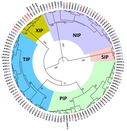Phylogenetic relationships among Nicotiana tabacum, Solanum tuberosum, and Solanum lycopersium AQPs. For this analysis, 35 selected subgroup representative StAQPs and SlAQPs were aligned with all NtAQPs using the Clustal Omega server (http://www.ebi.ac.uk/Tools/msa/Clustal Omega/) and a phylogenetic tree was constructed using Maximum Likelihood method based on the JTT matrix-based model with 1000 bootstraps. AQPs clustered into five different subfamilies (PIPs, TIPs, NIPs, SIPs, and XIPs). Each AQP subfamily is shown with a specific background color. NtAQPs are indicated in black; StAQPs and SlAQPs are in red and blue, respectively.