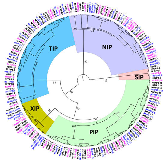 Phylogenetic relationships among N. tabacum (Nt) AQPs and its two ancestors, N. sylvestris (Ns) and N. tomentosiformis (Nto) AQPs. The deduced amino acid sequences of NtAQPs, NtoAQPs, and NsAQPs were aligned using the Clustal Omega server (http://www.ebi.ac.uk/Tools/msa/Clustal Omega/) and a phylogenetic tree was constructed using Maximum Likelihood method based on the JTT matrix-based model with 1000 bootstraps. The NtAQPs clustered into five different subfamilies (PIPs, TIPs, NIPs, SIPs and XIPs), with the corresponding NtoAQP and NsAQP subfamilies. Each AQP subfamily is shown with a specific background color. NtAQPs are indicated in black, NtoAQPs are in blue, and NsAQPs are in magenta.