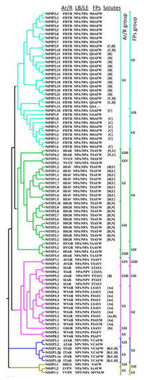 Grouping of N. tabacum PIPs, TIPs, NIPs, SIPs, and XIPs based on the ar/R and FPs. The phylogenetic tree was generated as described in Figure 1. The residues in the ar/R selectivity filter and the FPs were identified from the multiple sequence alignment, shown in Figures S1–S5. The ar/R and FP groupings within each subfamily were done based on the corresponding amino acid compositions, which are indicated on the right side of the phylogenetic tree. The solutes predicted, based on substrate specific signature sequences to be transported, are mentioned in square brackets. As, B, C, H, N, Si, Sb, and U indicate arsenic, boron, CO2, H2O2, ammonia, silicon, antimony, and urea, respectively.