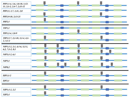 Aquaporins (AQPs), also known as major intrinsic proteins (MIPs), are small integral membrane proteins present in almost all living organisms [1,2]. Plants maintain a large and diverse AQP family compared to mammals. For instance, the genomes of rice (Oryza sativa), Arabidopsis (Arabidopsis thaliana), maize (Zea mays), soybean (Glycine max), switchgrass (Panicum virgatum), foxtail millet (Setaria italica), sorghum (Sorghum bicolor), Brachypodium distachyon, tomato (Solanum lycopersicum), poplar (Populus trichocarpa), cotton (Gossypium hirsutum), and potato (Solanum tuberosum) encode 39, 35, 36, 66, 68, 42, 38, 28, 47, 55, 71, and 41 AQP homologs, respectively [3,4,5,6,7,8,9,10,11,12], compared to only 13 AQP genes in mammals [13]. Based on phylogenetic analysis and subcellular localization, vascular plant AQPs are categorized into five subfamilies: (1) plasma membrane intrinsic proteins (PIPs); (2) tonoplast intrinsic proteins (TIPs); (3) nodulin-26-like intrinsic proteins (NIPs); (4) small basic intrinsic proteins (SIPs); (5) uncharacterized X intrinsic proteins (XIPs). To date, the latter subfamily has not been found in Brassicaceae and in monocots [14,15].