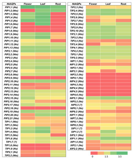 Expression analyses of 88 NtAQP genes in root, leaf, and flower. Color scale represents logarithmic FPKM values, where green indicates high expression and red indicates no or very low expression. Ns and Nto in parentheses indicate that corresponding NtAQP gene evolved from N. sylvestris (Ns) or N. tomentosiformis (Nto). Question mark (?) indicates that NtAQP gene origin (N. sylvestris or N. tomentosiformis) was not identified.