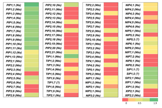 Expression analyses of 88 NtAQP genes in N. tabacum BY-2 cells. Color scale represents logarithmic FPKM values, where green indicates high expression and red indicates no expression or very low expression. Ns and Nto in parentheses indicate that corresponding NtAQP gene evolved from N. sylvestris (Ns) or N. tomentosiformis (Nto). Question mark (?) indicates that NtAQP gene origin (N. sylvestris or N. tomentosiformis) was not identified.