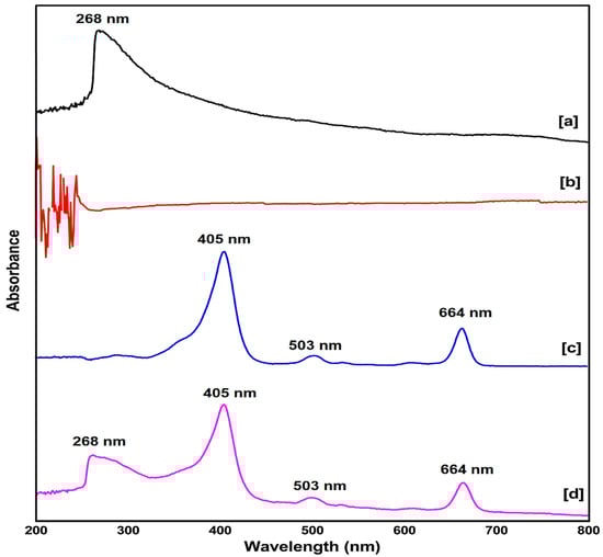 The primary confirmation of successful synthesis of the nanobiocomposite was done using the absorbance peak of the UV-vis spectrum for the compounds: SWCNTs, HA, Ce6, and SWCNTs-HA-Ce6 at 200–800 nm. The maximum absorbance peak for SWCNTs was recorded at 268 nm [19]. There was no characteristic peak for biopolymer HA in the range of 200–800 nm [20]. The photosensitizer Ce6 dissolved in the solvent DMF, which acted as a blank for all the samples, recorded three characteristic peaks, one maximum absorption peak at 405 nm and two peaks at 503 nm and 664 nm [21] (Figure 1). The synthesised nanobiocomposite dispersed in Millipore water, which acted as a blank, and the major peaks of SWCNTs and Ce6 were observed in SWCNTs-HA-Ce6. These results indicated the successful synthesis of SWCNTs-HA-Ce6. UV-Vis spectroscopy was also used to determine the PS loading efficiency (PLE) for the synthesised nanobiocomposite. Due to the large surface area of SWCNTs, loading efficiency of Ce6 was achieved at 70%, calculated using the PLE formula (PLE (wt%) = (weight of loaded PS/weight of PS in feed) × 100%). The SWCNTs and Ce6 are hydrophobic in nature, while the synthesised nanobiocomposite showed excellent dispersibility due to the coupling of HA molecules. Dispersibility studies for all the samples were performed by dissolving 1 mg of SWCNTs and 1 mg of SWCNTs-HA-Ce6 with 1 mL of Millipore water separately and mixing it vigorously, and the image captured is shown in Figure S1.