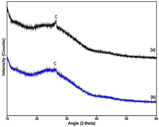 The X-ray diffraction data confirms the crystallinity of the nanosized particles, as well as the structural properties of the synthesized nanobiocomposite by comparison to the Joint Committee on Powder Diffraction Standards (JCPDS) number. The SWCNTs and SWCNTs-HA-Ce6 were deposited on a crystal silicon wafer for analysis. The XRD patterns of the SWCNTs are shown in Figure 3 and indicate that the characteristic peak at 26.3° corresponds to C (002) planes, according to JCPDS # 751621 reflecting graphite. The plane 002 indicates the presence of SP2 bonded carbon arrangements of SWCNTs [25]. For the synthesised nanobiocomposite, there was a mild shift at 25.8° and the intensity of peak was less characteristic in the plane 002. This may be due to the coupling of HA and Ce6, and there were changes observed in the crystalline nature of the nanobiocomposite. These results confirm the addition of HA and Ce6 on the SWCNTs.