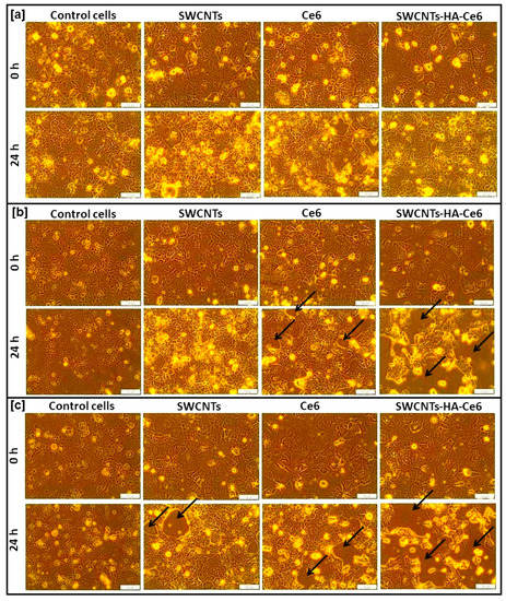 Microscopic images of untreated and treated cells. (a) group 1 cells (untreated) of 0 h and 24 h, (b) group 2 cells (5 J/cm2) of 0 h and 24 h (c) group 3 (10 J/cm2) cells of 0 h and 24 h. Scale bar represents 100 μm. Black arrow indicates the cellular death.