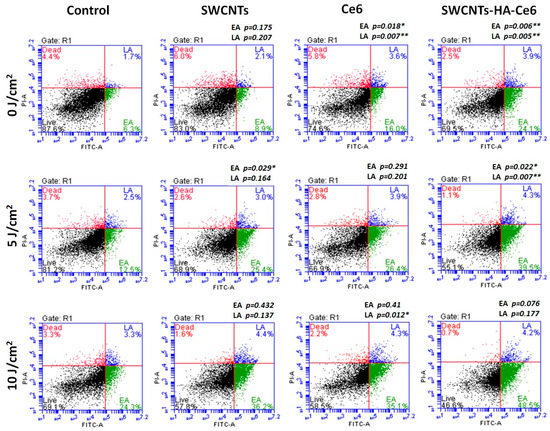 In early stage apoptotic cells, a statistical comparison between control and SWCNTs, Ce6 and SWCNTs-HA-Ce6 was performed. The 0 J/cm2 treated samples results showed that there was a significant difference observed in Ce6 (p = 0.018) and SWCNTs-HA-Ce6 (p = 0.006), whereas there was no significant difference in SWCNTs (p = 0.175); the 5 J/cm2 treated samples results showed that there was a significant differences observed in SWCNTs (p = 0.029) and SWCNTs-HA-Ce6 (p = 0.022), whereas there was no significant differences in Ce6 (p = 0.291); and 10 J/cm2 treated samples results showed that there was no significant differences observed in SWCNTs (p = 0.432), Ce6 (p = 0.41) and SWCNTs-HA-Ce6 (p = 0.076). Similarly, a statistical comparison was performed between control and SWCNTs, Ce6 and SWCNTs-HA-Ce6 in late stage apoptotic cells and the 0 J/cm2 treated samples results showed that there was a significant differences observed in Ce6 (p = 0.007) and SWCNTs-HA-Ce6 (p = 0.005), whereas there was no significant differences in SWCNTs (p = 0.207); the 5 J/cm2 treated samples results showed that there was a significant difference observed in SWCNTs-HA-Ce6 (p = 0.007), whereas there was no significant difference in SWCNTs (p = 0.164) and Ce6 (p = 0.201); and 10 J/cm2 treated samples results showed that there was a significant difference observed in Ce6 (p = 0.012), whereas there was no significant difference in SWCNTs (p = 0.137) and SWCNTs-HA-Ce6 (p = 0.177).
