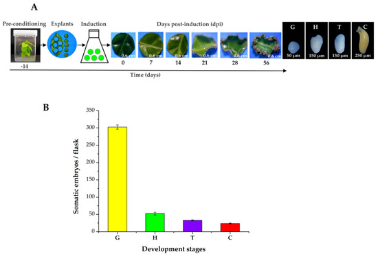 SE induction process in C. canephora. (A), On Day-14 (beginning of the pre-treatment), C. canephora plantlets were incubated in a pre-treatment medium (MS medium supplemented with NAA 0.54 µM and Kin 2.32 µM) for 14 days. After 14 days, explants were transferred into the induction medium (Yasuda medium supplemented with 5 µM benzyladenine) under photoperiod conditions (16/8 h) for 56 dai. (B), Total embryo production per flask was 402.3. The values corresponding to the different developmental stages were globular (G, 298), heart (H, 48.6), torpedo (T, 31.3), and cotyledonary (C, 24.3). The bars over the columns represent the mean value ± standard error of three independent experiments.