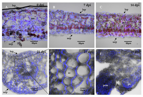 Histological analysis during the SE induction process in C. canephora. The leaf explants were composed of parenchymal cells of the spongy mesophyll, sm, and palisade mesophyll, pm. There were no changes in the explant cell structure, as shown in panel (A), which corresponds to the induction day (0 day); (B), 7 dai, and (C), 14 dai. (D), From 21 dai, the appearance of embryogenic cells, ec, was observed near the vascular tissue, vt. (E), a close-up view of the explants 21 dai showed dense embryogenic cells. (F), 28 dai, the proembryos, pe, were formed. The cell wall was stained with calcofluor white and chlorophyll is indicated in red. Other abbreviations: proembryogenic mass: pem; upper epidermis: uep; lower epidermis: lep. 0, 7, 14, 21, 28 dai of SE 30 µm cross-sections.