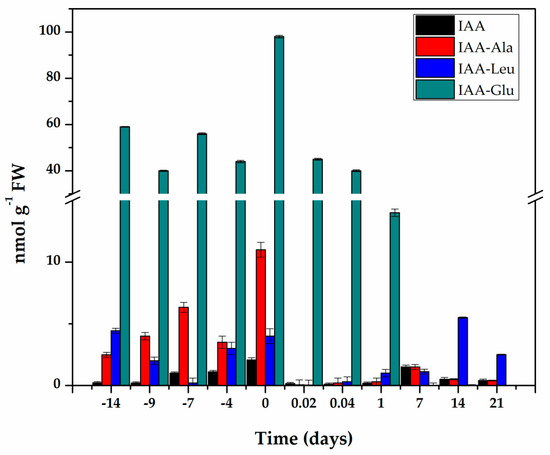 The conjugates with alanine and leucine made up 12.6% of the total IAA. These conjugates are very important for homeostasis of IAA, since they can be hydrolyzed and contribute to free IAA. The IAA-Ala increased from 2.49 nmol g−1 FW at the beginning of the pre-treatment to 11 nmol g−1 FW at the time of induction and decreased very quickly over the next 21 days. The IAA-Leu conjugate decreased during the first seven days of pre-treatment, and by the time of the induction of SE, had returned to its initial levels. This conjugate decreased very rapidly during the first hours of the induction of SE and then began to increase to levels ranging from 2.5 to 5.5 nmol g−1 FW in the following days (Figure 3).