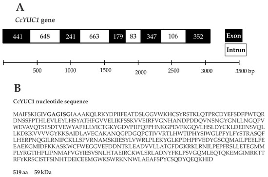 SE is a complex process that involves multiple factors, including the biosynthesis of IAA through the TAA/YUC pathway [35]. To test whether the CcYUC genes were participating during the SE induction process in C. canephora, we performed a quantitative expression analysis of CcYUC transcript levels. First, we determined how many YUC genes were in the genome of C. canephora (http://coffee-genome.org/ [36]). The search yielded eight YUC genes. Two copies of the CcYUC1 gene and two copies of the CcYUC10 gene were found throughout the genome. At the same time, we performed an analysis of the transcriptome of C. canephora [37]. The results showed the presence of five transcripts of CcYUC gene products during the induction of SE. Two of these five transcripts belonged to the CcYUC1. The locus of the CcYUC1 gene is on Chromosome six in the genome of C. canephora, and structurally consists of five exons and four introns with a length of 3060 base pairs (Figure 4A). The reading frame of the CcYUC1 gene predicted a 519 amino acid protein of 59 kDa molecular mass, with FAD motifs (Figure 4B) characteristic of flavin monooxygenase enzymes. To gather a complete picture of the participation of the CcYUC family during the induction of SE, we analyzed the expression of seven CcYUC genes, including the two copies of the CcYUC1 gene, CcYUC3, CcYUC4, CcYUC6, and CcYUC10 genes and one CcYUC-like gene (Supplementary Table S1).
