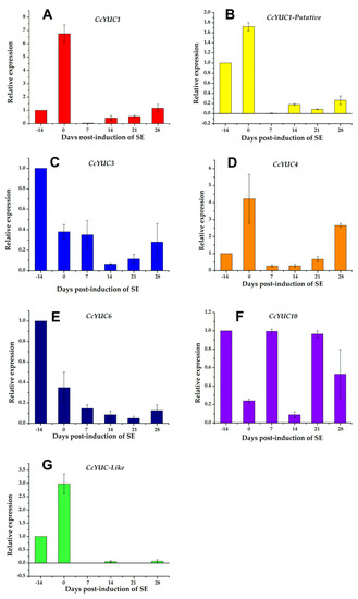 The analysis of the CcYUC expression was performed by qRT-PCR for samples taken on the −14, 0, 7, 14, 21, and 28 dai of SE. Among the CcYUC genes analyzed, it was found that the CcYUC1 gene was especially highly expressed, and its transcription level showed a distinguishably substantial increase on the zero days of SE induction (up to 6.8-fold) (Figure 5A). On Days 7, 14, and 21 of SE, the transcriptional activity of CcYUC1 decreased but then had a slight increase on Day 28 (up to 1.2-fold). In contrast, CcYUC1-putative was only expressed on Day 0 (Figure 5B), and CcYUC4 had two expression peaks, on Day 0 (up to 4.2-fold) and at 28 dai (up to 2.7-fold), respectively (Figure 5C). CcYUC3 (Figure 5D) and CcYUC6 (Figure 5E) genes showed low levels of transcripts compared to Day −14 throughout the entire SE induction process. CcYUC10 had very similar expression times 7 and 21 dai of SE (Figure 5F). The CcYUC-like gene was expressed only during the pre-treatment stage, with a 3-fold increase at the end of the pre-treatment and just before the explants were introduced into the induction medium (Figure 5G). Once in the explant was in the presence of the induction medium, the expression of the CcYUC-like gene disappeared. Of the seven analyzed CcYUC genes, four genes, including CcYUC1, CcYUC1-putative, CcYUC4, and CcYUC-like, were upregulated on Day 0, while CcYUC3 and CcYUC6 were downregulated during the SE induction process. The behavior of CcYUC10 did not follow a definite pattern along with the stages of induction of SE.