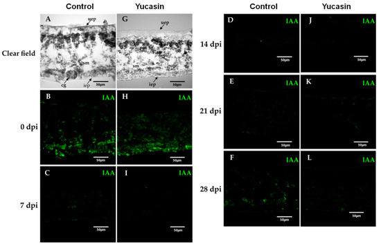 On the other hand, the immunolocalization assays of free IAA of the yucasin-treated samples revealed important changes in the IAA signal accumulation pattern. At Day 0 of the SE induction process, we found a free IAA auxin signal in explants treated with 100 µM yucasin (Figure 6H). The free IAA signal found was less intense than in the control samples (Figure 6B). The IAA signal disappeared from Day 7 to Day 21 after the induction of SE (Figure 6I–K). An essential difference from the control samples was the decrease in the IAA signal, in the presence of the yucasin, at 28 dai (Figure 6L) compared with the control at the same stage (Figure 6F).