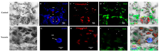 In control tissues, numerous chloroplasts were located within the spongy mesophyll cells (Figure 7A). These cells had prominent nuclei (Figure 7B). The free IAA signal was found both in the chloroplasts and in the nuclei of the spongy mesophyll cells (Figure 7E). We showed that IAA free of mouse anti-IAA monoclonal primary antibodies was specific (Figure 7D) and the signal was not mixed with chlorophyll (Figure 7C). In treatments with 100 µM of yucasin, the free IAA signal was found in the cytosol (Figure 7I) and not in the chloroplasts or nuclei (Figure 7G–J), as in the control.
