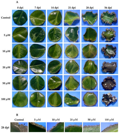 Effect of yucasin during the induction of SE in C. canephora. (A), Different concentrations of yucasin were applied exogenously (5, 10, 20, 50, and 100 µM) to the pre-treatment medium. The effect of yucasin was documented every seven days until 28 dai, and then at 56 dai of SE. (B), A comparison of the effect of yucasin 28 dai for all the yucasin concentrations. Note the abundance of proembryogenic mass on the control, as well as the presence of proembryos (black arrow).