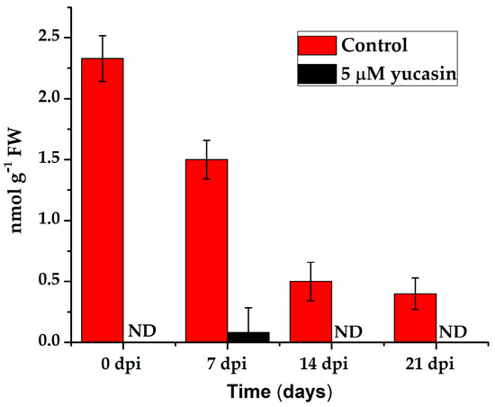 Quantification of the IAA endogenous content in leaf explants of C. canephora treated with 5 µM yucasin. Samples were collected at 0, 7, 14, and 21 days after SE induction. The bars over the columns represent the mean value ± standard error of three independent experiments. ND: not detected.
