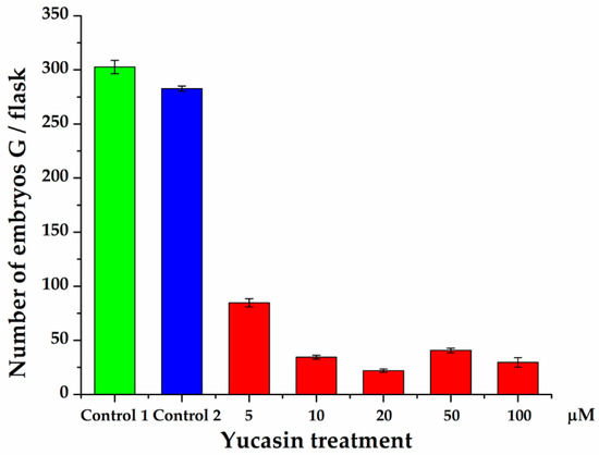 Quantification of the number of embryos produced 56 dai showed a significant decrease in the number of embryos produced by the explants exposed to the yucasin inhibitor (Figure 10). In the presence of the inhibitor, only globular-shape embryos were formed. The decrease varied from 72 to 94% of the control. Even the lower concentration of the inhibitor produced a sharp decrease in the number of embryos. In the presence of 10 µM–100 µM of yucasin, the number of globular embryos was less than 40 embryos per flask, in comparison with 300 globular embryos per flask for the control.