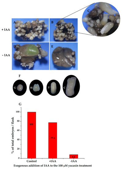 The exogenous addition of IAA restored somatic embryogenesis in explants previously treated with 100 µM yucasin. (A,B), Restoration of somatic embryogenesis by exogenous application of IAA to explants treated with 100 µM yucasin. (C), Close-up shows the presence of somatic embryos at different stages of development. (D,E), Explants in the presence of 100 µM yucasin. (F), Different development stages of somatic embryos after four weeks in the presence of exogenous IAA. (G), The total percentage of embryos formed in flasks with and without IAA.