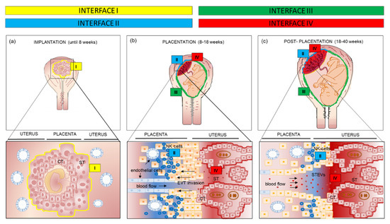 Main immunological interfaces between fetus and mother according to different gestational ages, from implantation to placentation process and post-placentation period. (a) Until 8 weeks of gestation the interface I is represented by ST invading the decidua; (b) in the second trimester of pregnancy the interface I is replaced by the interface II (decidual natural killer cells—extravillous trophoblast), III (decidua parietalis—amniochorion) and IV (maternal blood—ST); (c) in the third trimester interface IV is the dominant one. CT: cytotrophoblast; ST: syncytiotrophoblast; EVT: extravillous trophoblast.