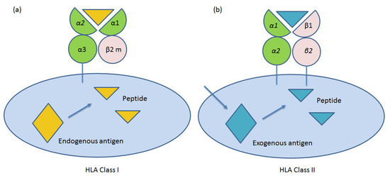 HLAs class I (A, B and C) molecules (Ia) consist of a glycosylated heavy chain and a light chain β2-microglobulin. The heavy chain has three extracellular domains (α1, α2 and α3), a transmembrane region and an intracytoplasmic domain. The α1 and α2 domains contain variable amino acid sequences, and these domains determine the antigenic specificities of the HLA class I molecules (Figure 2a). Class I HLA molecules are expressed on the cell surface of all nucleated eukaryotic cells. They also occur on platelets, but not on red blood cells. Their role is to protect “self” healthy cells from immune cells recognition. According to the “missing self” hypothesis, the absence or altered expression of HLA class I molecules renders target cells susceptible to NK cell attack [9]. Furthermore, another function of HLA class Ia molecules is to display peptide fragments of proteins from within the cell (damaged or infected) to cytotoxic T cells; this will trigger an immediate response from the immune system against not-self antigens [10].