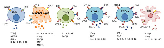 Main immune cells involved in immune tolerance at feto-maternal interface. APC: antigen presenting cell; CTLA4: cytotoxic T-lymphocyte associated protein-4; dNK: decidual natural killer cell; HLA: human leukocyte antigen; IL: interleukin; ILT-2: immunoglobulin-like transcript 2 receptor; IFN: interferon; KIR: killer cell Ig-like receptors; LAG3; lymphocyte activation gene-3; MCP: monocyte chemoattractant protein; NKG2: natural killer group 2 receptor; PD1: programmed cell death 1; TCR: T cell receptor; TGF: transforming growth factor; TLR: toll-like receptor; TNF: tumor necrosis factor.