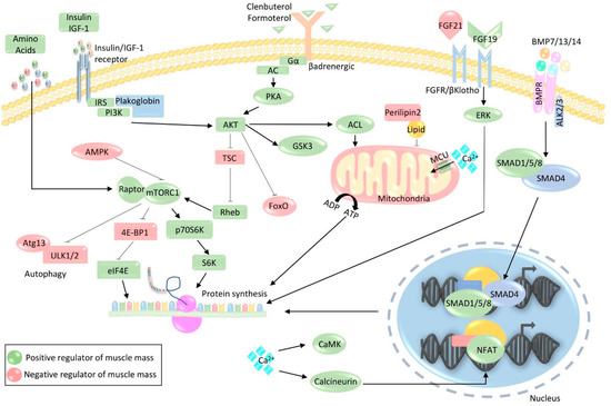 Pathways involved in protein synthesis. During muscle hypertrophy, the binding of insulin-like growth factor 1 (IGF-1)/insulin to their respective receptors activates IRS–PI3K–Akt–mTORC1 signaling, which is further stimulated by the presence of amino acids. The mTORC1 complex then enhances protein synthesis by inhibiting the eukaryotic translation initiator factor 4E (eIF4E) inhibitor 4E-binding protein 1 (4E-BP1) and activating p70S6K-S6-mediated protein translation. mTOR also blocks proteolysis by inhibiting autophagy initiation factors Unc-51 like autophagy activating kinase (ULK) 1/2. Clenbuterol and formoterol promote hypertrophy by binding to the adrenergic receptor and activating adenylate cyclase (AC)-PKA signaling, which culminates in the activation of Akt-mTOR. In addition to enhancing protein synthesis, Akt also blocks proteolysis by phosphorylating and inhibiting members of the forkhead box O family of transcription factors (FoxO), as well as activating glycogen synthase kinase (GSK) 3 and ATP citrate lyase (ACL). Fibroblast growth factor (FGF)19 enhances protein synthesis by binding to the βKlotho receptor and stimulating the extracellular signal-regulated kinase (ERK), which directly contributes to protein synthesis. Moreover, the binding of bone morphogenetic protein (BMP)7/13/14 to the BMPR receptor promotes muscle growth through the formation of a SMAD1/5/8–SMAD4 complex, which activates a hypertrophic transcriptional program. Calcium signaling also contributes to hypertrophy through the activation of calmodulin (CaM)-dependent kinase (CaMK) and phosphatase calcineurin, which stimulates the pro-growth transcription factor nuclear factor of activated T-cell (NFAT). Increased availability of nutrients and energy in the form of ATP further contribute to the auspicious environment that is permissive for muscle growth. Green shapes indicate positive regulators of muscle mass, whereas red shapes indicate negative regulators.