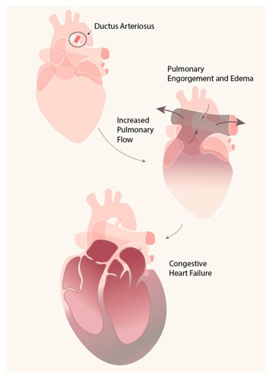 The ductus arteriosus (DA) is a shunt vessel between the aorta (Ao) and the pulmonary artery (PA) during the fetal period that is essential for the normal development of the fetus. The DA sometimes persists after birth and causes common clinical morbidity, especially in low-birthweight infants [1]. The blood from the high-pressure Ao shunts to the low-pressure PA (left to right shunt) and causes pulmonary edema and decreases systemic perfusion, notably renal, mesenteric, and cerebral circulation [2]. The increased hemodynamic burden brought by pulmonary overcirculation eventually results in congestive cardiac failure, as shown in Figure 1.