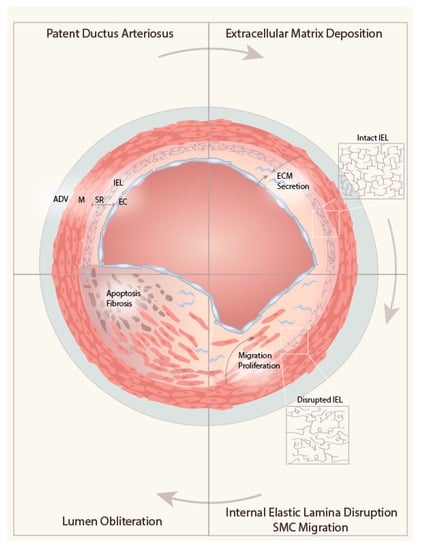 The changes in the ECM that induce neointimal formation are also observed in pathological conditions in pulmonary and coronary arteries. The plasticity of the pulmonary circulation in the perinatal period also involves matrix regulation. Processes that prevent the regular decrease in pulmonary vascular resistance have been proposed to impair matrix regulation and cause aberrant developmental and structural changes in the PA. These changes in development include abnormal SMC differentiation, hypertrophy, and proliferation, which exacerbate high pulmonary artery pressure. Degeneration of SMC is usually observed ≥5 days post-delivery [82] following DA functional closure. Accumulation of SMC undergoing cystic necrosis in the closing DA is proposed to be caused by ischemia of the constricted vessel wall. Literature has also shown that apoptotic cells, rather than necrotic cells, are frequently seen in areas of cystic necrosis. Goldberg et al. demonstrated that the combination of hypoxia and hypoglycemia increased apoptosis in lamb DA tissues [83]. Furthermore, isolated instances of apoptosis were also reported in the area of intimal thickening after birth [84].