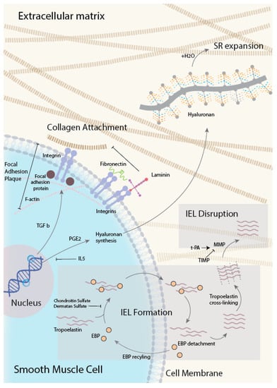 Sulfated glycosaminoglycan (GAG) and chondroitin sulfate (CS), were found to modify elastin metabolism in DASMCs. Hinek et al. demonstrated that both N-acetylgalactosamine GAGs, CS and dermatan sulfate (DS) cause the release of 67 kD elastin binding protein (EBP) from the SMC and thus, impairs the assembly of elastin fiber. The authors observed that there is an intrinsic reduction of EBP in the fetal lamb. When neonatal rat Ao SMC was incubated with CS and DS, EBP was reduced through a mechanism of shedding from SMC membranes into the conditioned medium. This process was associated with impaired elastin fiber assembly. With these findings, Hinek et al., propose that an increase of CS or DS impairs assembly of newly synthesized elastin in DA and allows intimal thickening development [35].