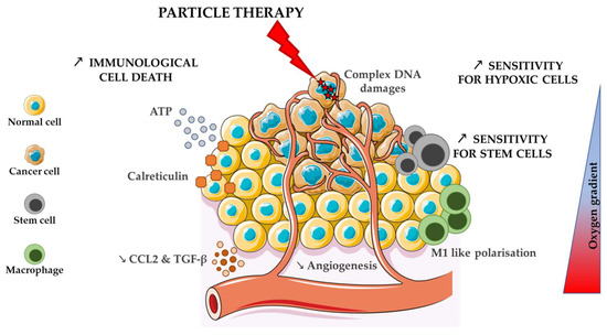 As evidenced in the previous section, charged particles also present an increased density of ionisation leading to an enhanced biological response due to the higher complexity of DNA damage. This enhanced response of tumour cells could help trigger T cells and TAMs response.