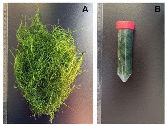 (A) A Taxiphyllum barbieri 10 g biomass grown in tap water; (B) the same biomass can be manipulated and compressed adapting to a smaller volume container with limited damage. Centimeters scale shown on the left of each picture.