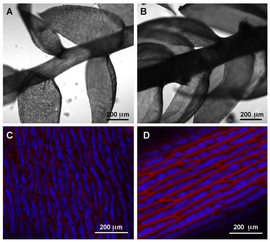 Microscopic images of moss gametophores observed at different magnification. (A) Light- green moss gametophore; (B) Dark-green moss gametophore; (C) Leaflet cells of light-green moss; (D) Leaflet cells of dark-green moss. (A,B) Confocal transmitted-light images; (C,D) Confocal sections, 3 μm projection showing chlorophyll (in blue) and cell wall autofluorescence (in red). The scale bar length is indicated in each frame.