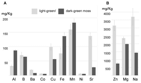 Two moss biomasses, with different colors due to growth in the same medium but different light conditions, accumulating over 24 h several elements with different efficiency (n = 3). (A) section shows elements represented with less than 200 mg/kg; (B) section shows elements represented at higher concentrations. The value in milligrams per kilogram represents the accumulation in control conditions. Error bars represent standard deviation.