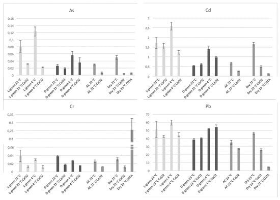 Accumulation of the four elements, As, Cd, Cr, and Pb in moss biomasses treated in different ways. For each element it is possible to see the values, starting from the left, related to light-green moss incubated at 23 °C without washing (L-green 23 °C), after washing with CaCl2 (L-green 23 °C CaCl2), incubated at 4 °C without washing (L-green 4 °C), after washing with CaCl2 (L-green 4 °C CaCl2), dark-green moss incubated at 23 °C without washing (D-green 23 °C), after washing with CaCl2 (D-green 23 °C CaCl2), incubated at 4 °C without washing (D-green 4 °C), after washing with CaCl2 (D-green 4 °C CaCl2), autoclaved light-green moss incubated at 23 °C without washing (AC 23 °C), after washing with CaCl2 (AC 23 °C CaCl2), dry light-green moss incubated at 23 °C without washing (Dry 23 °C), after washing with CaCl2 (Dry 23 °C CaCl2), after CDTA extraction (Dry 23 °C CDTA). Data are expressed as mg/kg of dry weight. Error bars represent standard deviation (n > 4).