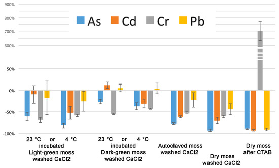 We analyzed the amount of As, Cd, Cr, and Pb accumulated in moss biomass under different temperature conditions (23 °C and 4 °C) and after different washes which were able to remove elements associated with polysaccharides. In particular, in Figure 4 it is possible to observe the accumulation of the four elements in light-green or dark-green moss at 23 or 4 °C and the effect of washing with CaCl2. It is then possible to observe the accumulation in an autoclaved biomass, deprived of an active protoplast, and the accumulation in a dry biomass, after washing with CaCl2 and after pectin removal through CDTA extraction.