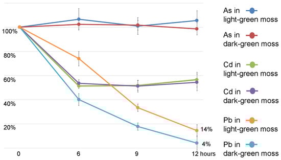 Concentration reduction of the HMs in the liquid samples collected from the experiment presented in Figure 6 at different time intervals (6, 9, 12 h). Data are expressed as percentage of the HM treatment at time 0. The two kinds of light- or dark-green biomass and the element measured are distinguished by colors. Error bars indicate standard deviation (n = 3). Variation in As concentration is not significant even compared to control conditions. Cd reduction has no statistical differences when comparing the two kinds of moss. Pb concentration change is differentiated in different moss kinds.