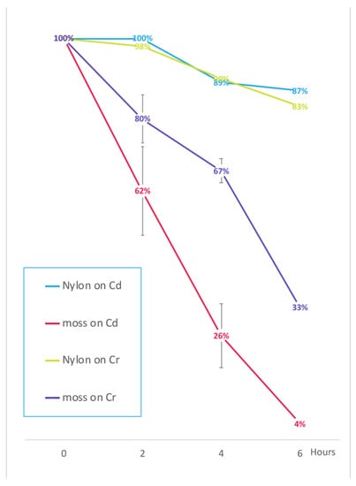 Moss ability to uptake Cd reached its maximum after 6 h (Figure 8) as already evidenced by previous analysis. It was possible to calculate the uptake of about 4.3 g cadmium per kg dry weight (DW obtained after 3 days at 50 °C) of moss within six hours.