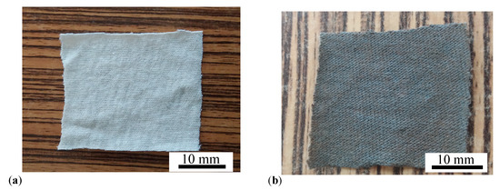 - From the cotton fabric, with a height of 0.6 mm, six pieces are cut in the form of a square with edge length of 30 mm, as shown in Figure 12a. Out of the six pieces, we form three double-layered structures, by superimposing two pieces on top of each other;