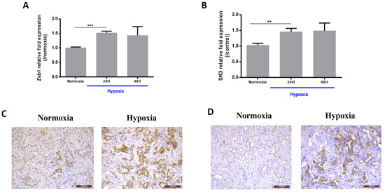 We next investigated whether these findings could also be reproduced in clinical samples. Hypoxic conditions were tested in human malignant prostate tissue slices (N = 4 patients). Figure 1C,D shows representative immunohistochemistry pictures of Zeb1 and SK3 protein expression under normoxic and hypoxic conditions. Under normoxic conditions, cancer cells showed focal or absent Zeb1 expression, without significant SK3 staining. Hypoxia led to an increase in Zeb1 (4 cases out of 4) and SK3 (3 cases out of 4) expression, with a diffuse positive staining.