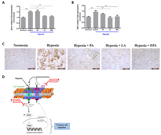 Hypoxia was found to initiate multiple adaptive responses, allowing cancer cells to survive in a hostile microenvironment [11]. Recent findings demonstrate the relationship between hypoxia and calcium (Ca2+) in different cancer types [12]. Ca2+ signaling is significantly remodeled in several cancer cell types, and gives them advantages for proliferation, migration, invasion, and resistance to apoptosis [13]. We previously demonstrated the pivotal role of the SK3 channel, a Ca2+-activated potassium channel, regulating Ca2+ entry in breast, colon, and prostate cancer aggressiveness [14,15,16]. SK3 has been shown to form complexes with Ca2+ channels, leading to an increase in cytosolic Ca2+ concentration in cancer cells and metastasis development. Interestingly, SK3 is located in cholesterol-enriched membrane nanodomains, also known as lipid rafts, and its function is dependent on the lipid environment [14]. We previously identified a fatty acid (FA) profile inversely associated with PCa aggressiveness and characterized by high levels of linoleic acid (LA) and eicosapentaenoic acid (EPA) [17]. Furthermore, we highlighted that these FAs exert their protective effects through a reduction of Ca2+ entry, involved in Zeb1 upregulation induced by TGFb, another EMT inducer [16]. In the present study, we report that hypoxia-induced Zeb1 is associated with activation of SK3 channel expression in PCa cells and subsequently affects their potential of aggressiveness. Moreover, and most importantly, the protective lipids identified in human PCa, namely LA and EPA, were found to totally reverse this process.