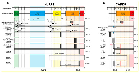 Isoforms of human NLRP1 and CARD8. (a) Full-length NLRP1 consists of five domains, an aminoterminal pyrin domain (PYD), a NACHT domain (NACHT), a leucine-rich repeats domain (LRRs), a function-to-find domain (FIIND), and a carboxyterminal caspase activation and recruitment domain (CARD). Self-processing occurs at S1213 in the SF/S motif of the FIIND. NLRP1 is encoded by up to 17 exons. Exon 8 is missing in isoform 4 (NACδ) and isoform 3 (NACγ) whereas exon 14 is missing in isoform 2 (DEFCAP-S, NACα) and isoform 3 (NACγ). Isoform 5 and 7 have 4 amino acids (GKSH) insertion after A1044 or A78, respectively. Selected NLRP1 mutations in human disease with skin involvement are depicted (for more information refer to Table 1). (b) CARD8 contains two domains, a FIIND and a CARD, with a variable aminoterminus and is encoded by up to 11 exons. T54 isoform misses exon 2 whereas isoform 1 (T48), isoform 2 (short), and T51 have alternative splicing replacing exons 1-3. CARD8 short, long and T47 have a deletion at A153 and A148, respectively. The SNP rs2043211 causes mutations in T60, T54, and T48, introducing in the latter a stop codon. Alternative splicing with translation of part of an intron generates a T47 isoform, which misses the nonsense mutation found in T48. Most of the variants of NLRP1 and CARD8 are poorly characterized.