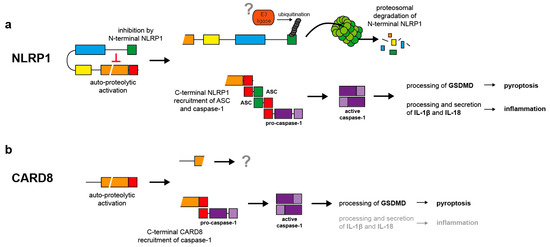 Mechanisms of NLRP1 and CARD8 activation. (a) NLRP1 activation is initiated by self-processing in the FIIND. However, the aminoterminal fragment inhibits the carboxyterminal effector protein containing the CARD by a non-covalent interaction. Upon ubiquitination of the aminoterminal inhibitory fragment by unknown ubiquitin ligases, the latter is degraded by the proteasome. The liberated effector fragment induces ASC speck formation, followed by caspase-1 activation and in turn processing of proIL-1β and -18 and gasdermin D (GSDMD). Secretion of the cytokines induces inflammation supported by GSDMD-induced pyroptosis. (b) Activation of CARD8 is poorly understood. Most likely, self-processing induces direct activation of caspase-1 without participation of ASC. In contrast to NLRP1, CARD8-induced caspase-1 activation causes mainly pyroptosis by GSDMD cleavage rather than processing of proIL-1β and -18.