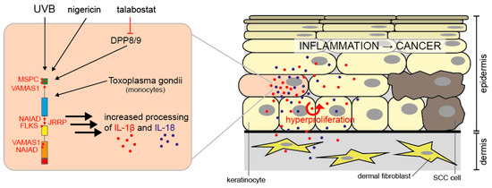 NLRP1 activation in human keratinocytes. In human keratinocytes, NLRP1 is activated by UVB radiation, nigericin, or talabostat. Toxoplasma gondii activates NLRP1 in monocytes. Via caspase-1 activation, this causes processing and secretion of proIL-1β and -18. IL-1β and -18 induce hyperproliferation of epidermal keratinocytes by autocrine and paracrine signaling and inflammation. Chronic NLRP1-dependent inflammation in the skin predisposes patients to the development of SCCs, a type of keratinocyte-derived skin cancer [43,71,106,113].